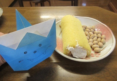 皆様が持っている『鬼の豆入れ』は、1月に全員で折り紙で作ったものです。