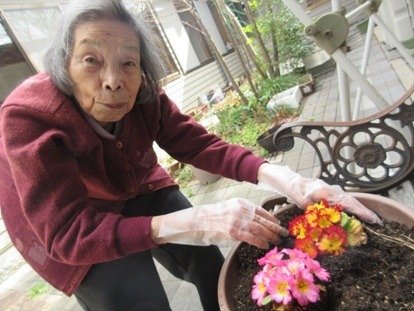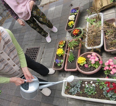 中庭に、色とりどりの春のお花をたくさん植えました!