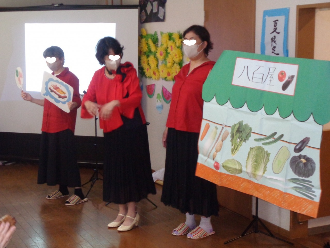 歌、踊り、紙芝居、金色夜叉、野菜ゲームなどなど色々楽しませて頂きました。