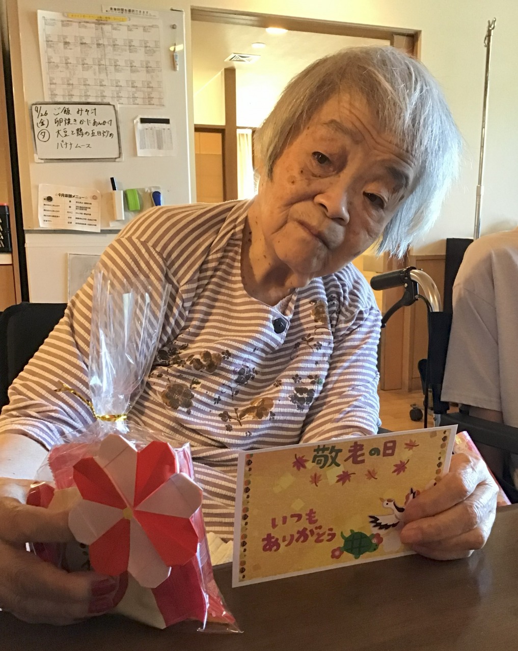 先日敬老の日レクにてご入居者様の皆さまにたこまんのお菓子セットをプレゼントしました!