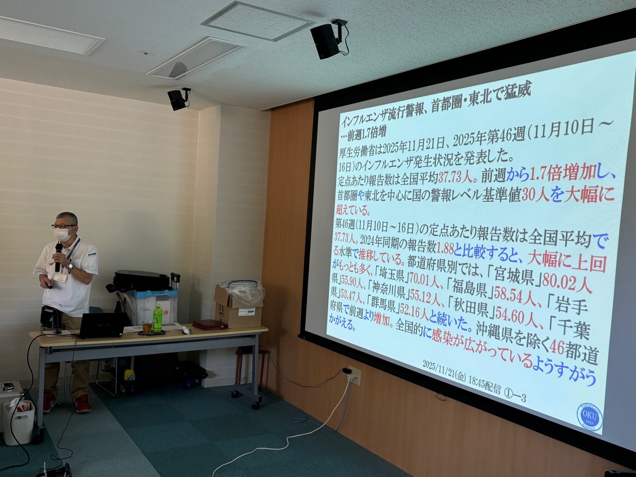 前半の座学では、インフルエンザや新型コロナウィルスの発生事例とその対策