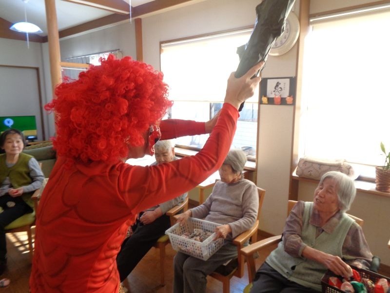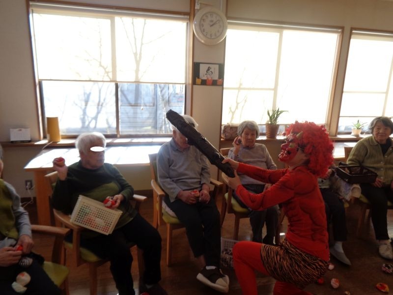 「鬼は~外!」と豆に見立てたお手玉を投げ、大きなかけ声とたくさんの笑い声が飛び交いました。