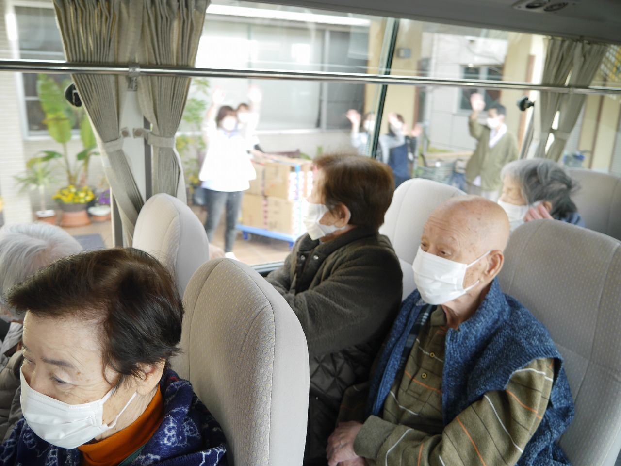 職員の誘導で皆様、車に乗って出発です!!