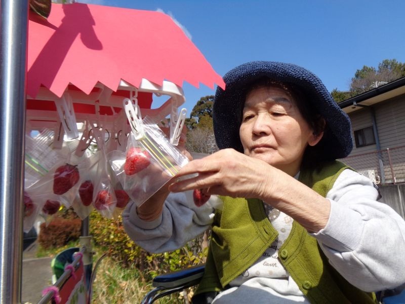 職員が洗濯ハンガーに沢山のいちごを吊るしセッティング完了‼