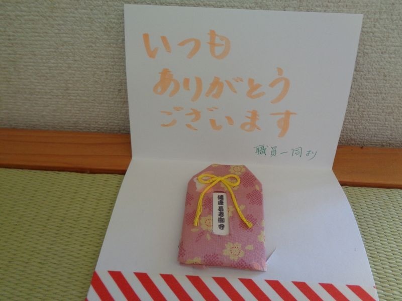 職員手作りのお守りもメッセージカードに添えると「まあ・・素敵な物をどうもありがとうね!」と感謝のお言葉をいただきました。