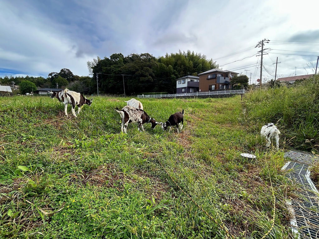 6頭一列に並んでついてきます。子ヤギも逃げることなく沢山雑草を