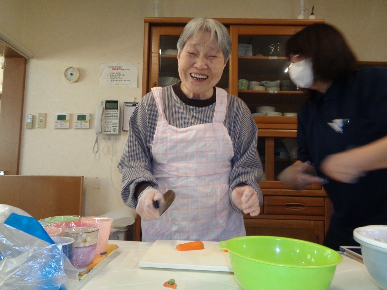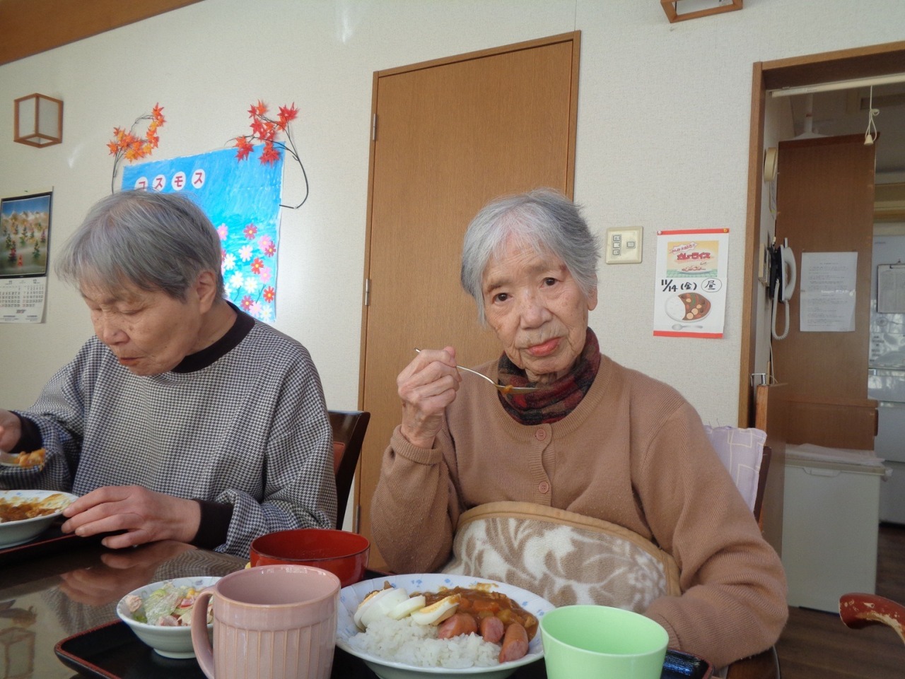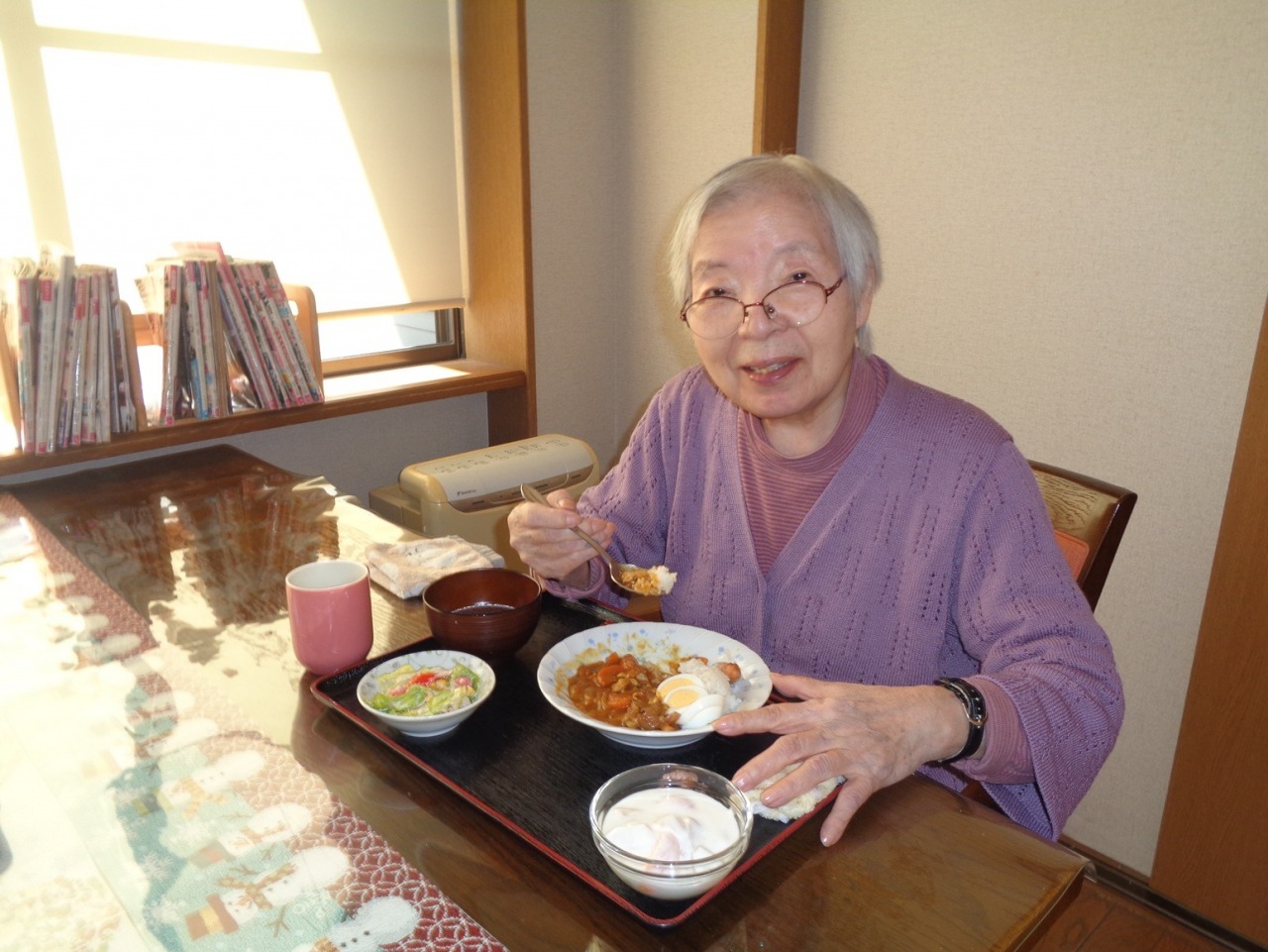 利用者様にお手伝いして頂き、カレーライス・サラダ・ヨーグルト・スープが出来上がりました。