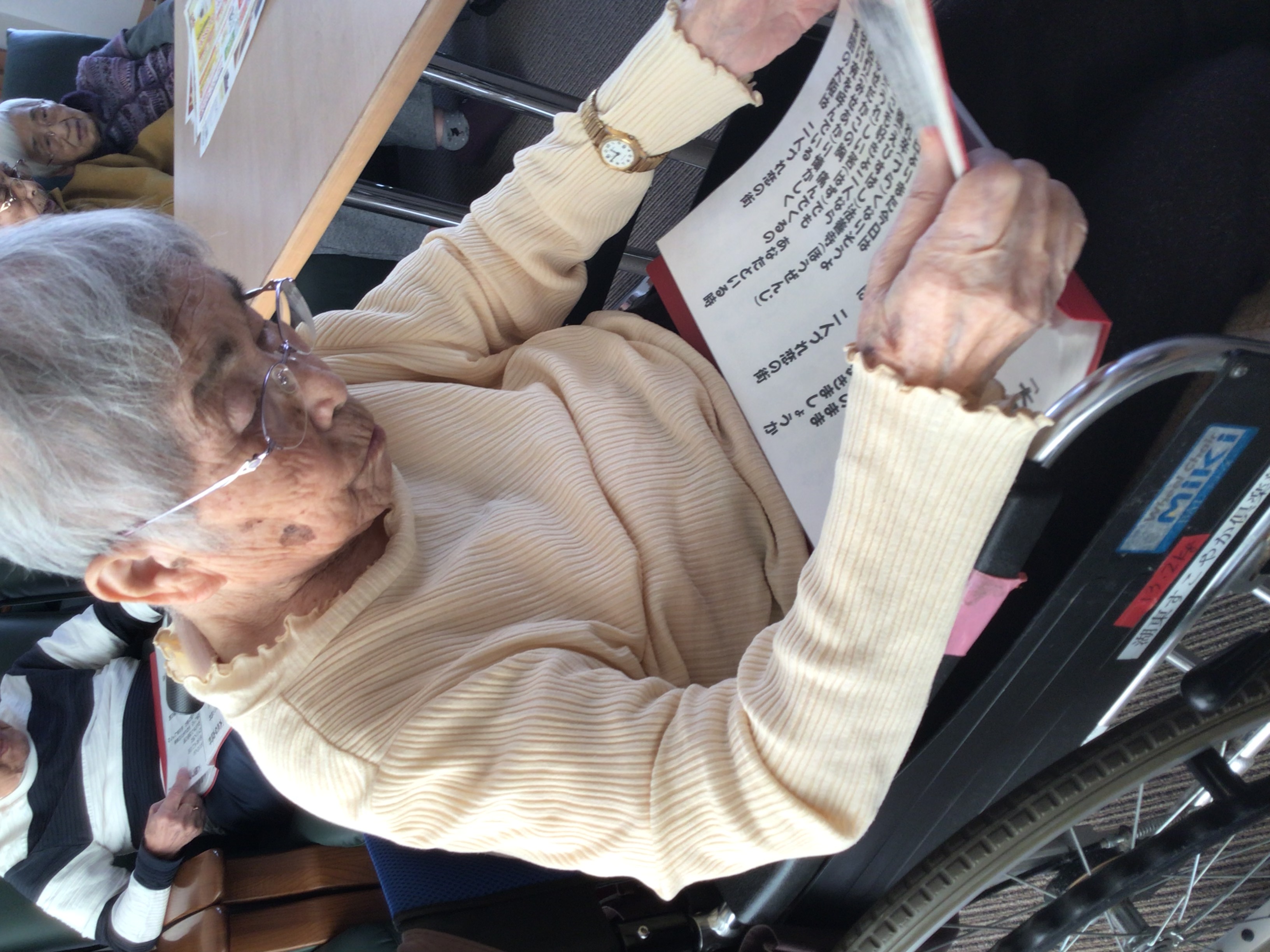今日は2階の談話室で歌体操のDVDを皆様と鑑賞し、その後 歌詞本を見ながら歌を歌いました。