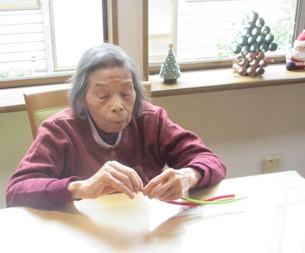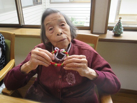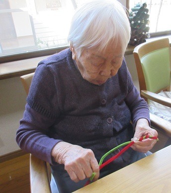 その職員の指導の元、モールを使って小さなクリスマスリースを作りました。
