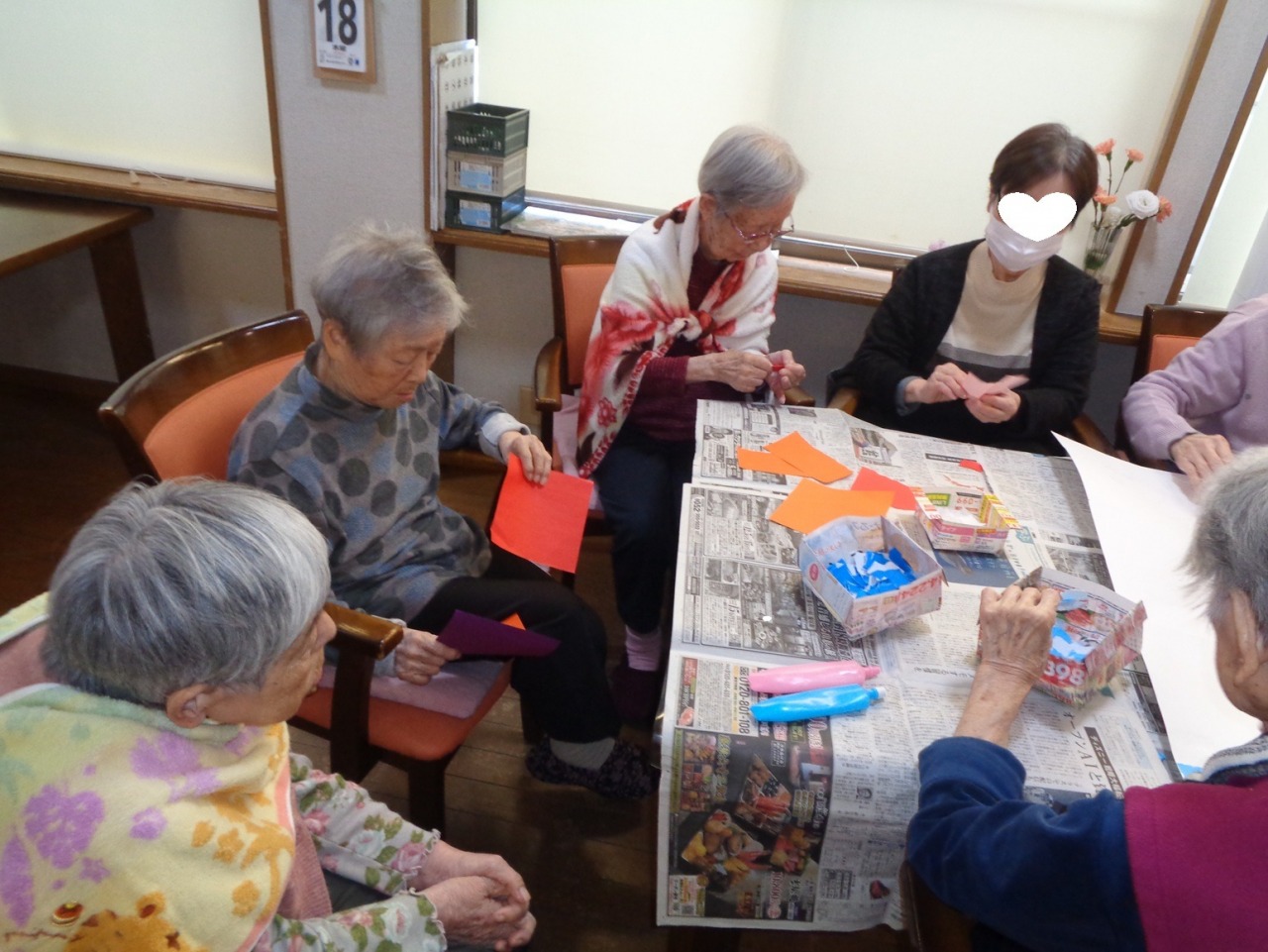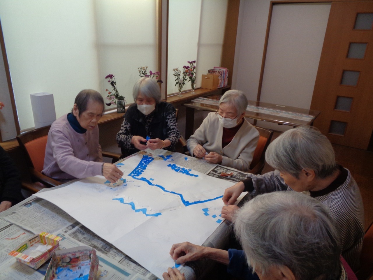 皆でテーブルを囲んでおしゃべりしながら、大きな富士山を貼り絵で描いています。