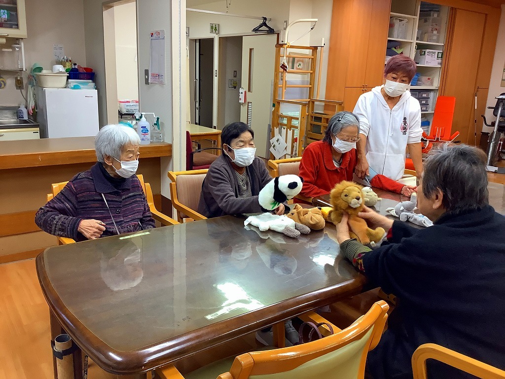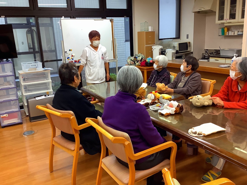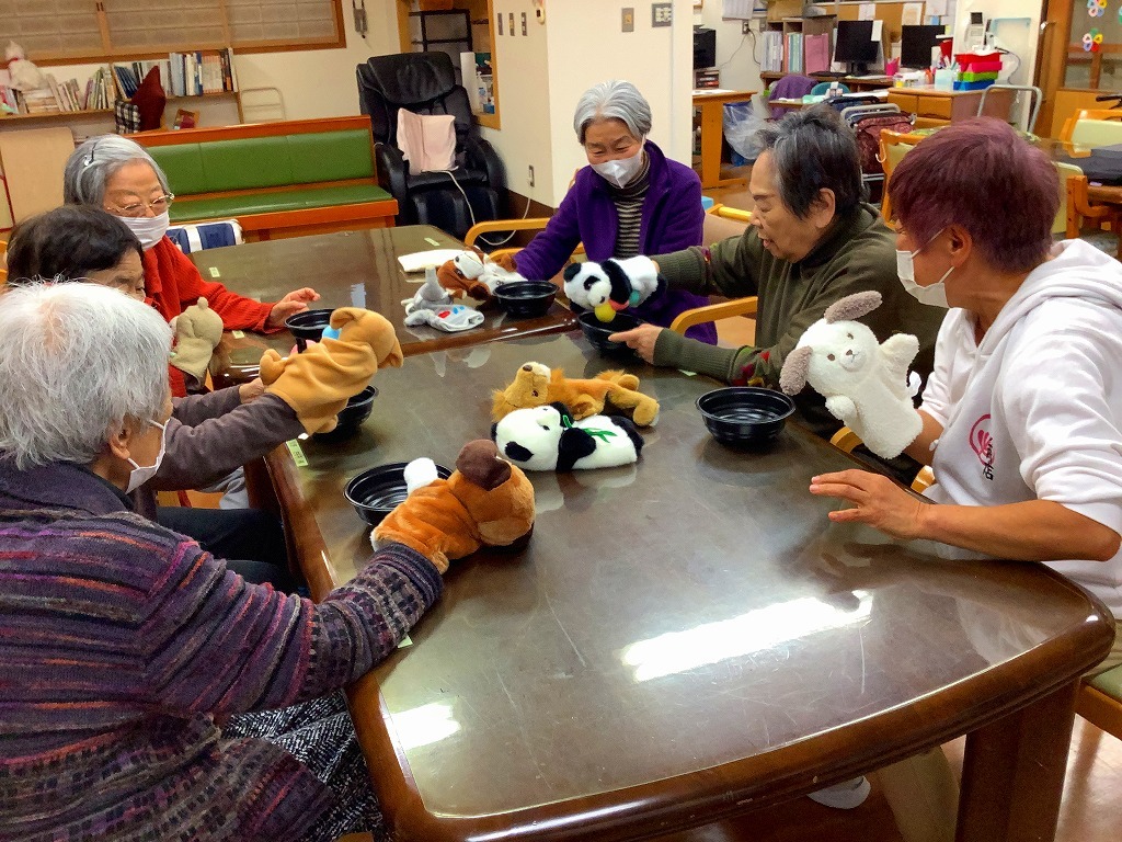 ハンドパペットを使ってピンポン玉を掴み隣の方に渡すリレーをしました。