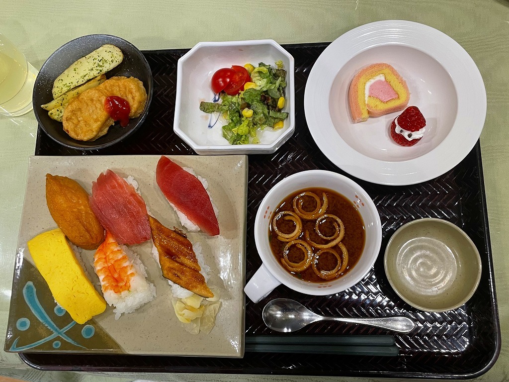 夕食豪華でしたよ。お寿司はおかわりもありました。