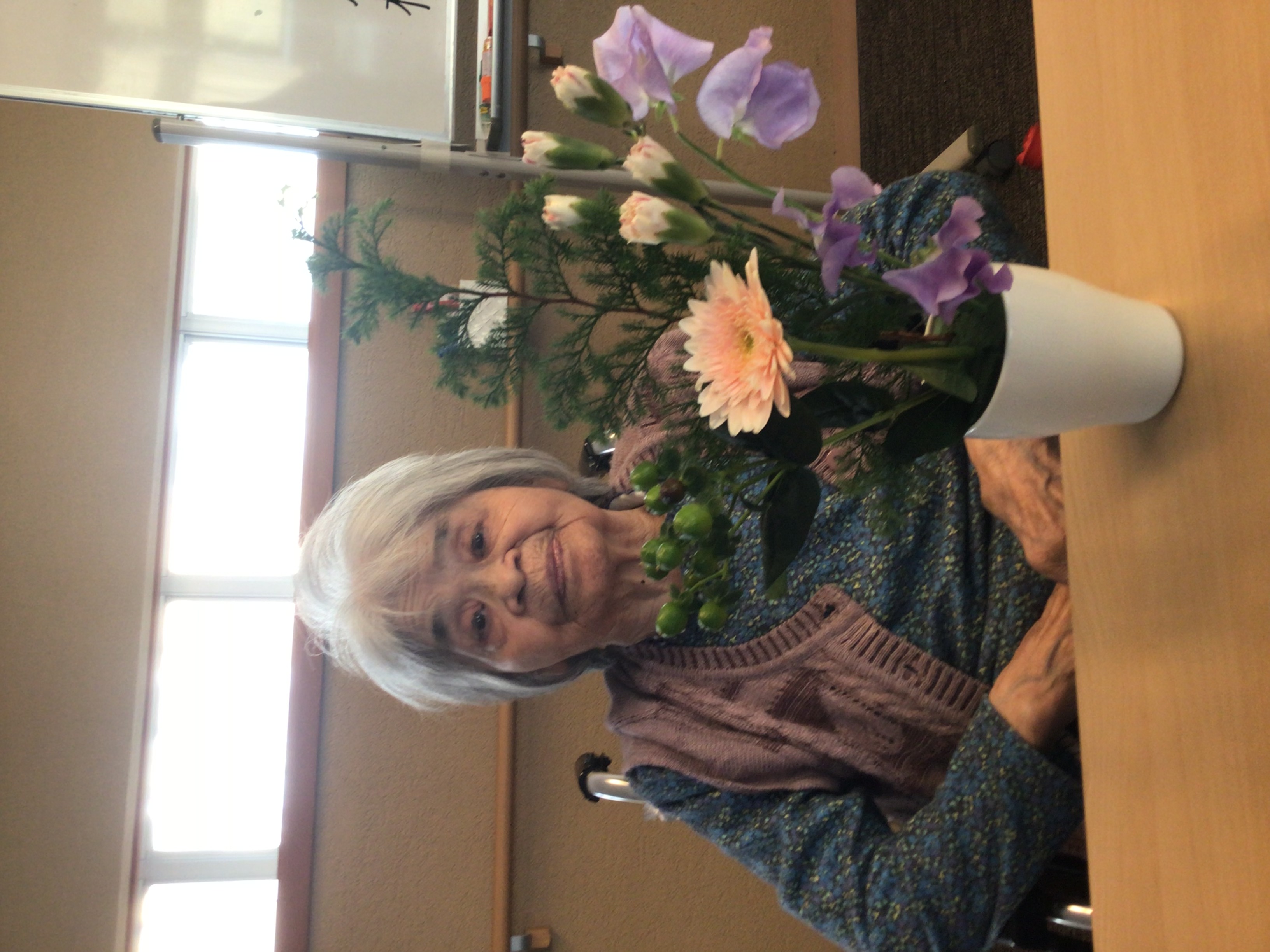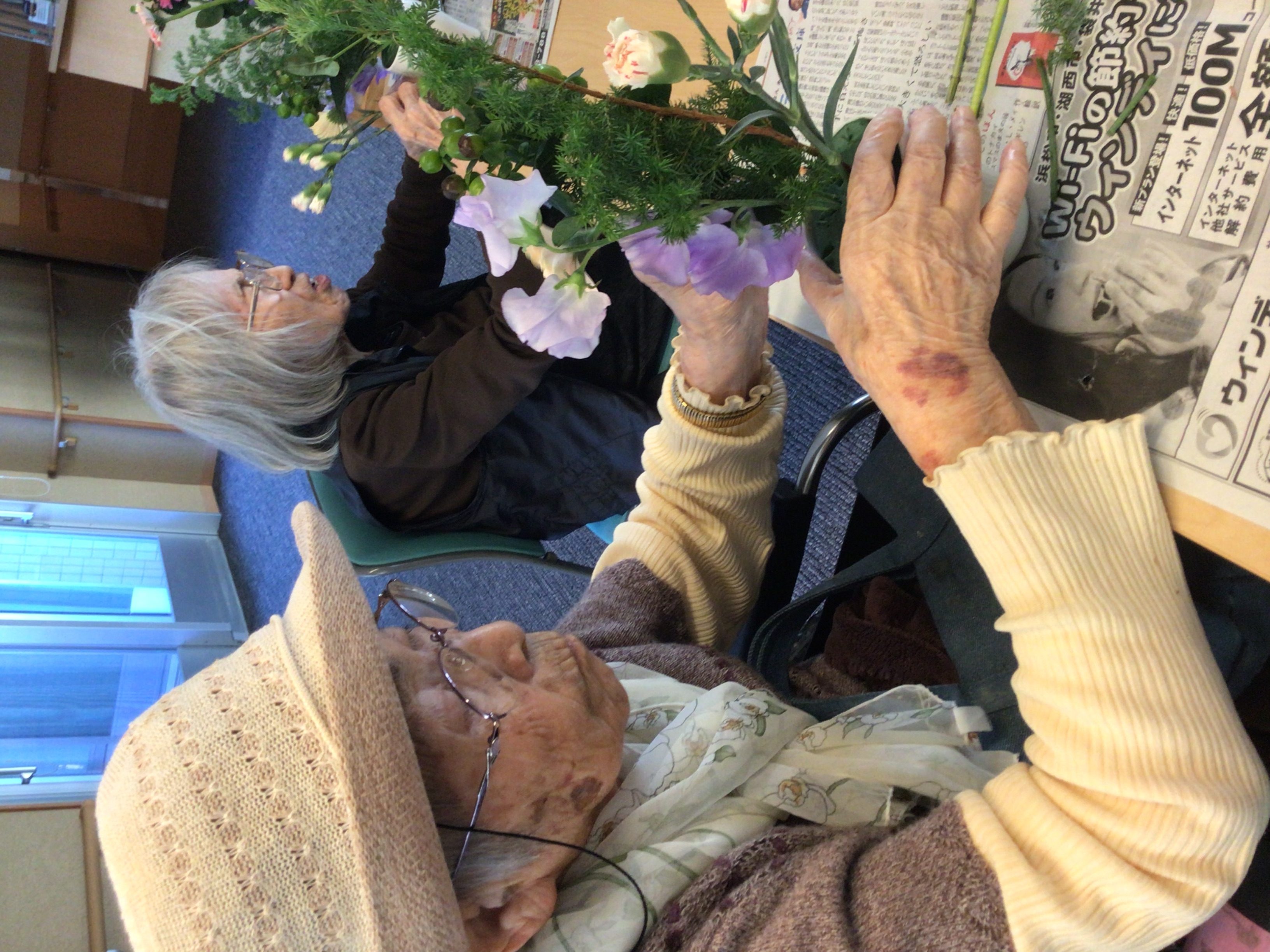 皆さんにも、手伝ってもらっており、居室への飾りをしてもらおうと、フラワーアレンジメントを行ってもらいました。