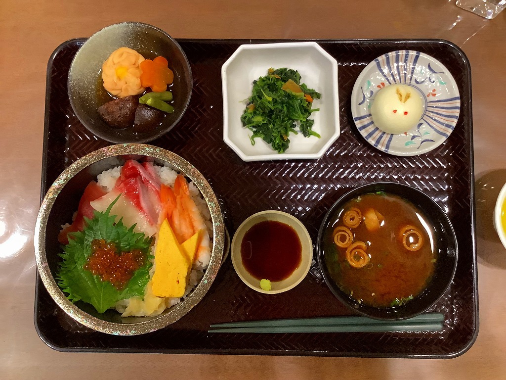 ・生海鮮ちらし寿司・赤だし(麩・なめこ)・華つつみの煮物・ほうれん草の菊花和え
