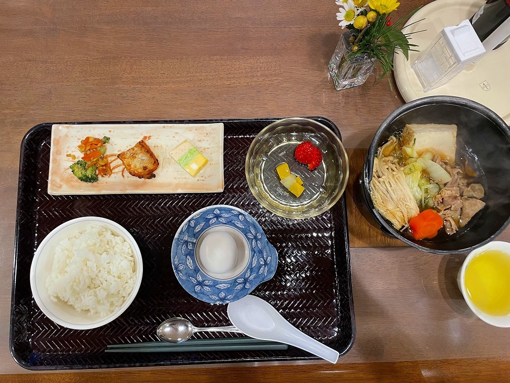 ・ご飯 ・すきやき鍋 ・花つつみ ・ブロッコリーのくるみ和え ・甘鯛西京焼き